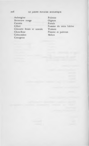 20Ô LE JARDIN POTAGER BIOLOGIQUE Aubergine Poireau Betterave rouge Oignon Carotte Panais Céleri Pomme de terre hâtive Chicorée frisée et scarole Tomate Chou-fleur Piment et poivron Concombre Melon Courgette