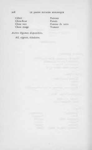 208 LE JARDIN POTAGER BIOLOGIQUE Céleri Poireau Chou-fleur Panais Chou vert Pomme de terre Chou rouge Tomate Autres légumes disponibles. Ail, oignon, échalotte.