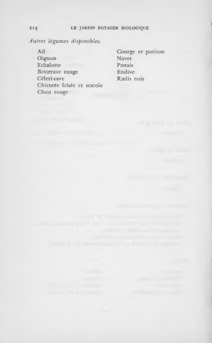 214 LE JARDIN POTAGER BIOLOGIQUE Autres légumes disponibles. Ail Courge et potiron Oignon Navet Echalotte Panais Betterave rouge Endive Céleri-rave Radis noir Chicorée frisée et scarole Chou rouge