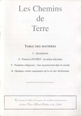 Les Chemins de Terre TABLE DES MATIÈRES 1 - Introduction 2 - François DUCRET: un artiste méconnu 3 - Vocations religieuses : leur rayonnement dans le monde 4 - Quelques scènes marquantes qe la vie des Vaillierands - / -