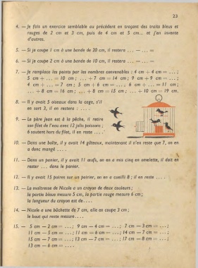 12. — Il y avait 15 poires sur un poirier, on en a cueilli 8 ; il en reste ... .