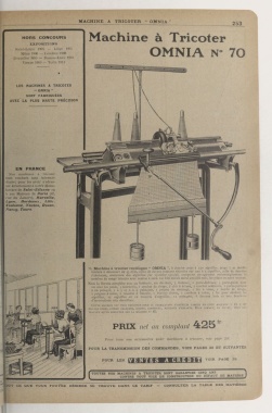 70. Machine à tricoter rectiligne " OMNIA ", à chariot court à 2)0 3 aiguilles, jauge 7 et double